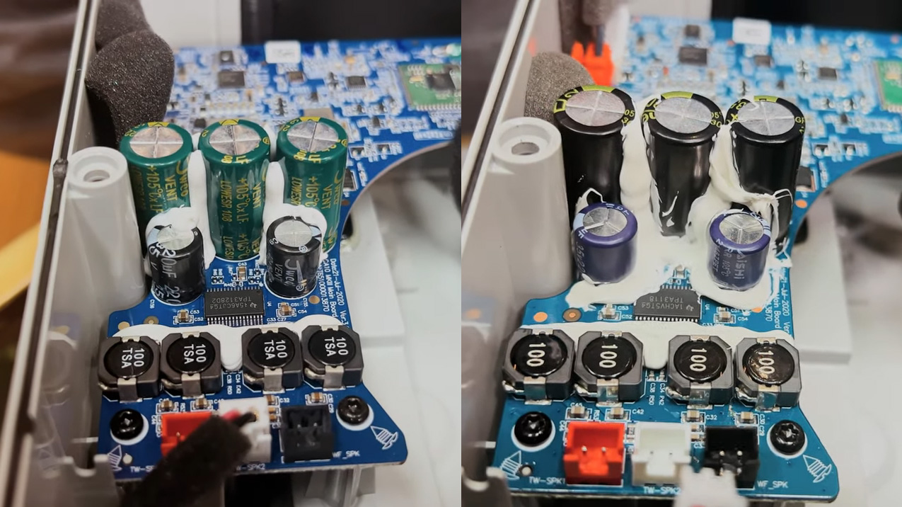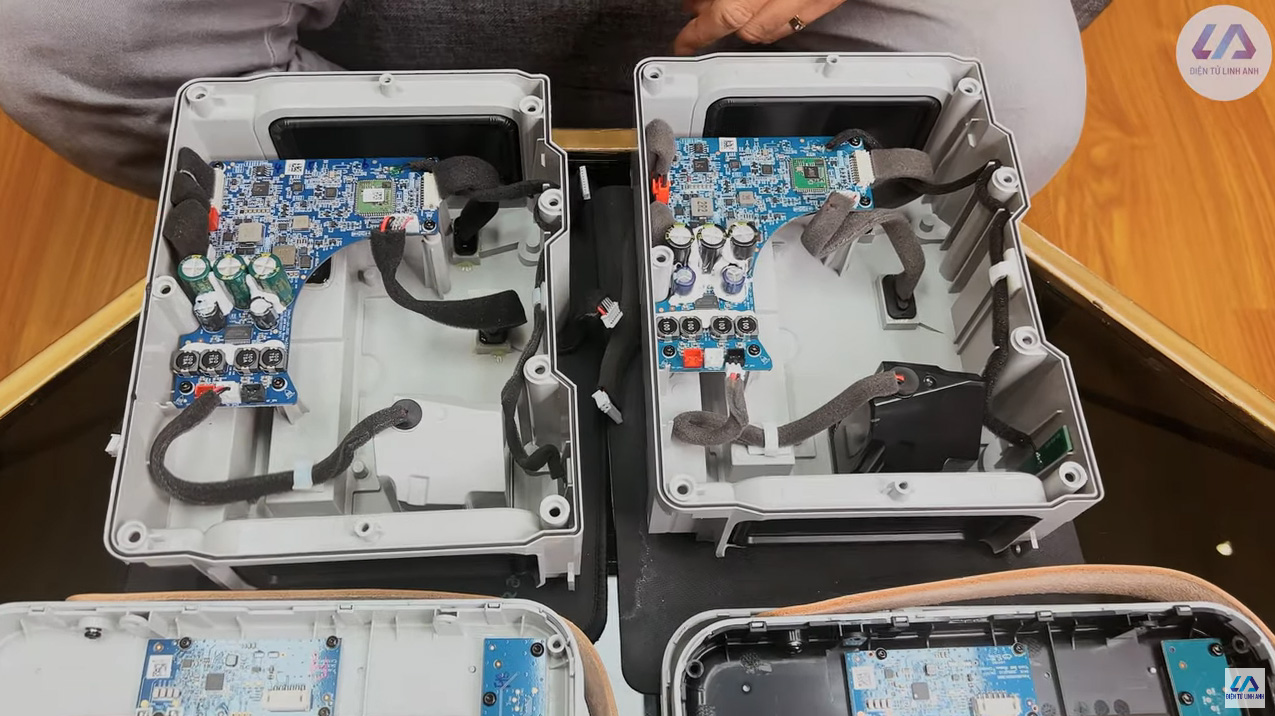 3.แผงวงจร ฝังชิพเหมือนกันบางตัว และต่างกันหลายชิ้น โดยเฉพาะชิ้นสำคัญ ของแท้จะใช้ชิพแท้จากโรงงานงานแบรนด์ ของปลอม ชิพตลาด โดยเฉพาะ Amplifier ชิพขยายเสียง ของแท้ใช้อย่างดี ของปลอมใช้ เกรดตลาดที่หาซื้อทั่วไปได้ (ดูรูปกระกอบได้)