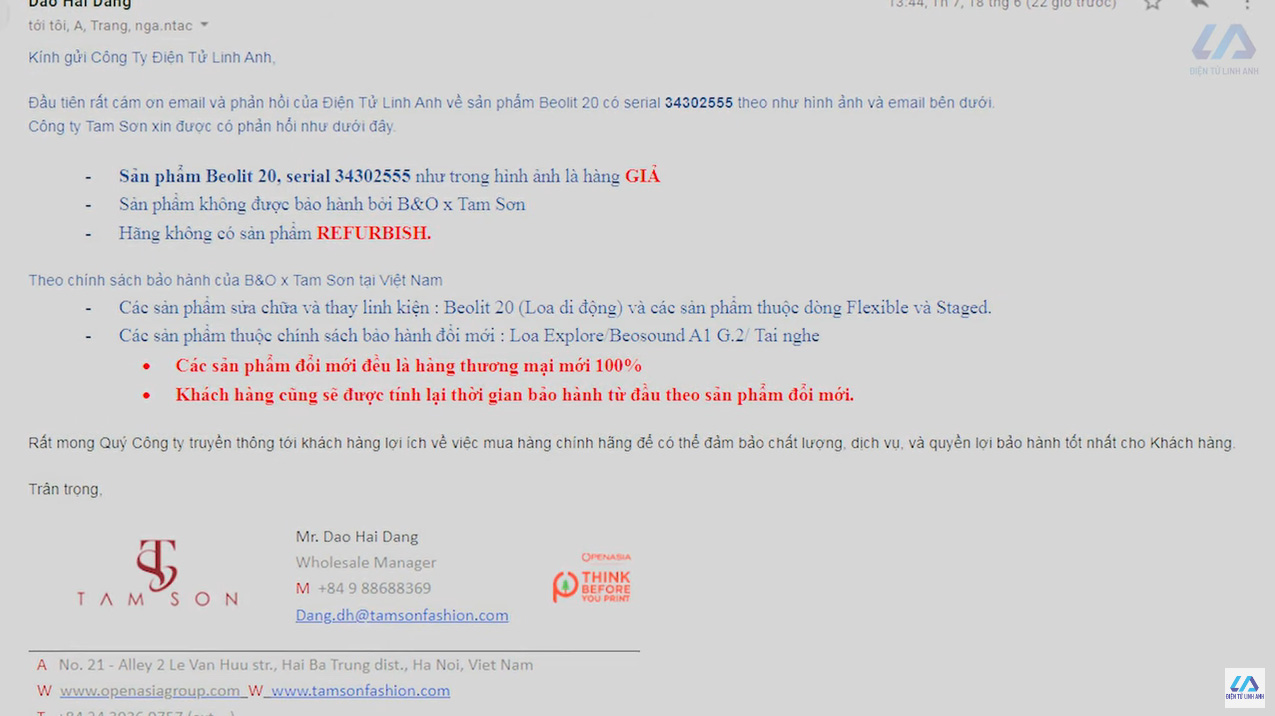 ** ทำไมถึงฟันธงว่าปลอม ทางคนทำคลิปได้ส่งจดหมายไปสอบถามตัวแทนอย่างเป็นทางการ และได้คำตอบว่าตัวเครื่องที่ส่งให้ตามรูป และ S/N ที่สอบถามมา แม้จะต่อแอปได้ แต่ก็เป็นเครื่องปลอม ที่ไม่ใช่เครื่องซ่อม และในเวียดนามไม่มี Refurbished แน่นอน (ถ้าแปลไม่ผิดนะคะ แต่ถ้าผิดแจ้งแก้ไขได้ค่ะ)